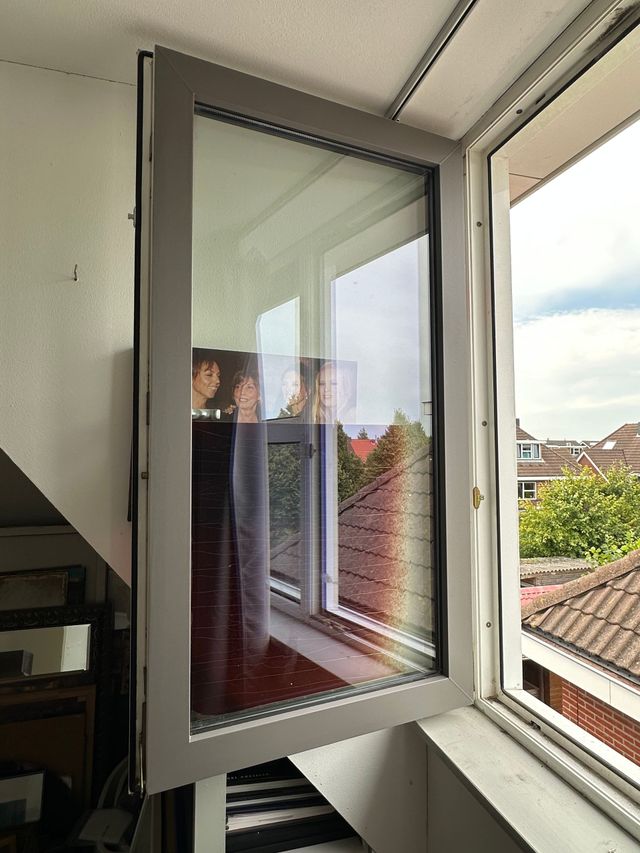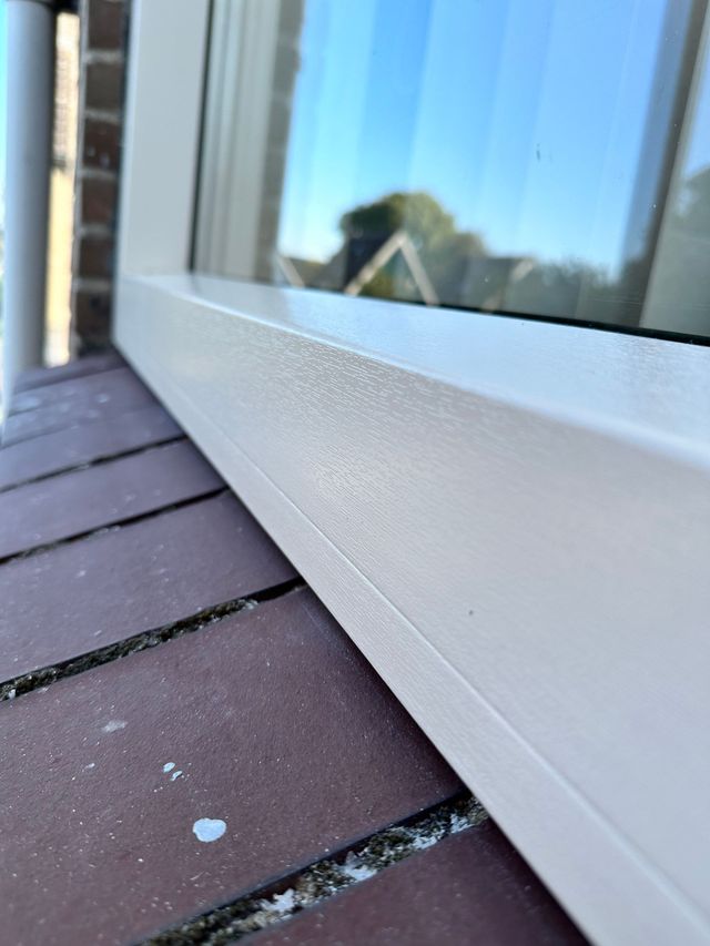 Folie laag op de kozijnen is verweerd en kapot gegaan door jaren van weers invloeden.